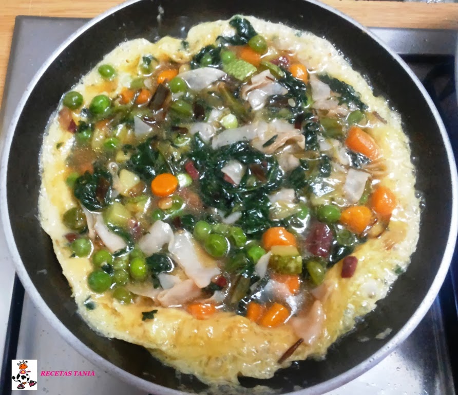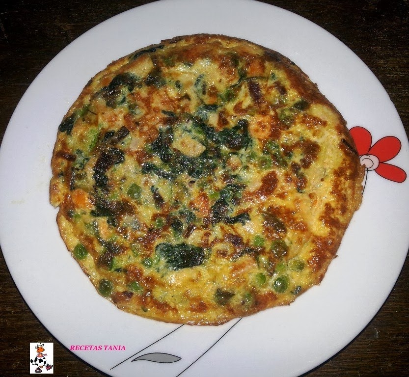 Preparación: En un bol batimos los huevos con un poquito de sal y reservamos. En una sarten ponemos un chorrito de aceite de oliva y sofreímos la verdura bien picadita. Añadimos la zanahoria, las espinacas,las habichuelas (judias verdes), los calabacinos,el puerro,la pechuga de pollo picadito y por último los guisantes (la cantidad que queráis poner de verdura). Cuando este todo bien pochadito lo añadimos al bol donde tenemos los huevos batidos. Mezclamos todo bien y hacemos la tortilla.