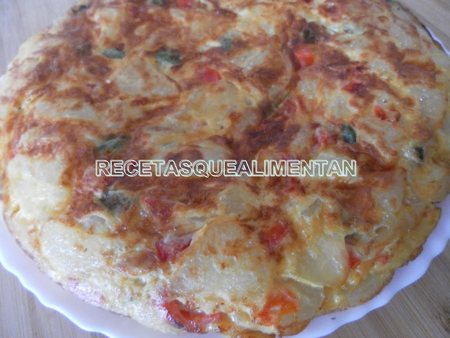 500 gr. patatas, 6 huevos, un calabacín mediano, medio pimiento verde, medio pimiento rojo, una cebolla, aceite de oliva, sal.