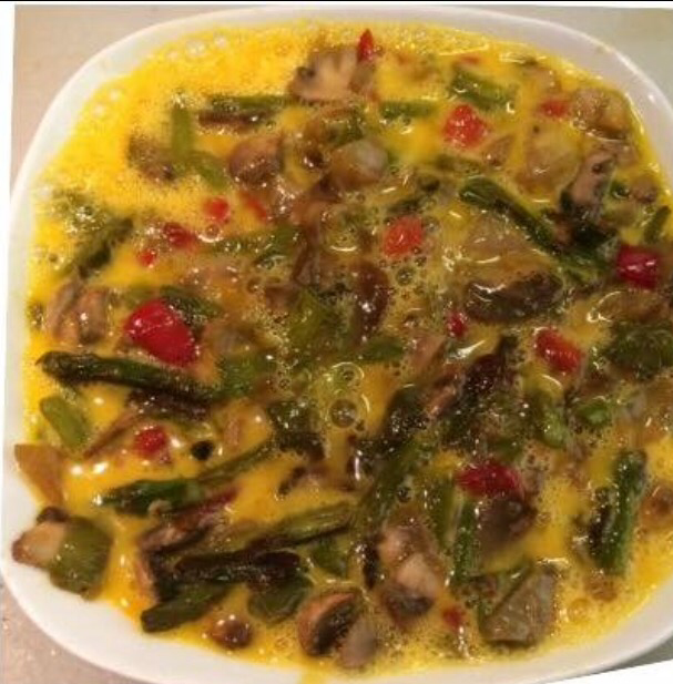 En una sartén sofreír las verduras con un poco de aceite , poner un poco de sal .Barir los huevos y mezclar todo