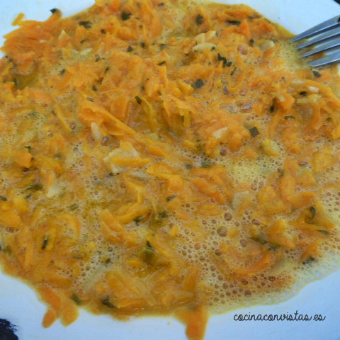 Apagamos el fuego y dejamos en la sartén. Batimos los huevos en un bol amplio y le añadimos sal, incorporamos la zanahoria cocinada y mezclamos bien.