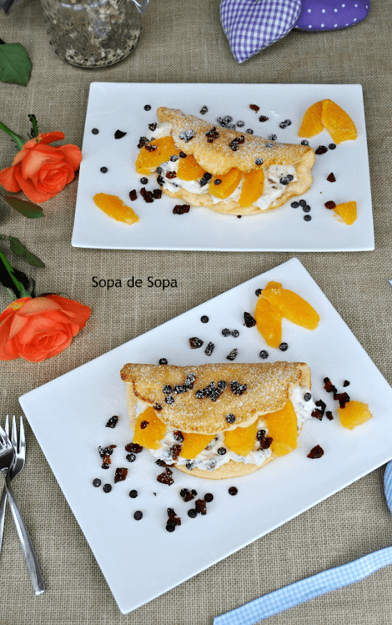 Montaje; Colocar una tortilla por plato y cubrir cada una con ¼ de la crema Cassata y gajos de naranja.