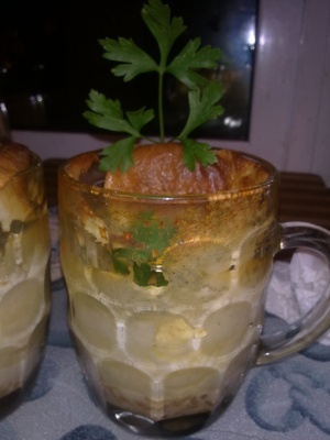 Mi presentación, como mi receta es más de pueblo que la original, en lugar de presentarla en una copa de lujo, presentare la tortilla en esas jarras de cerveza de medio litro, como veis en la foto.