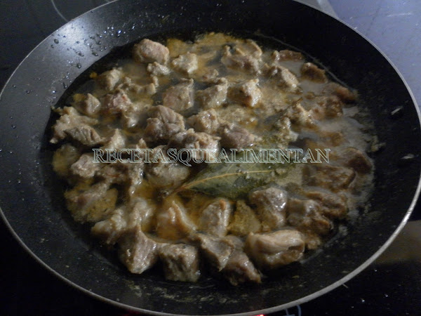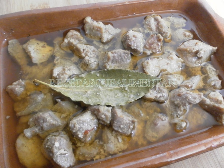 Preparamos la carne en adobo el día anterior para ello, troceamos la carne de cerdo en dados pequeños y los colocamos en un bol.