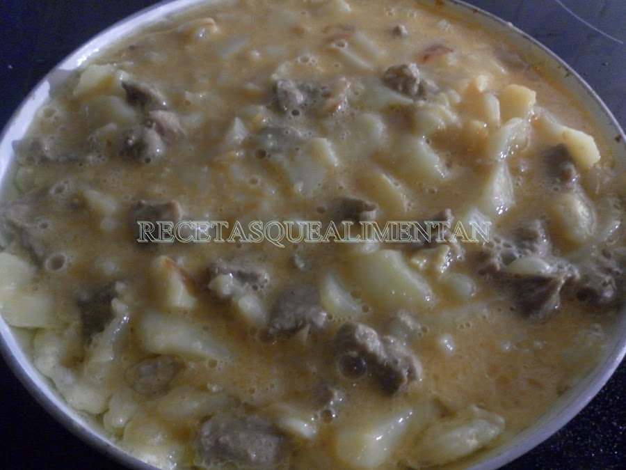 4 patatas medianas, 6 huevos, 500 gr carne de cerdo, 4 dientes de ajo, laurel, tomillo, orégano, una cucharadita de pimentón dulce, pimienta negra, vino blanco, aceite de oliva, sal.