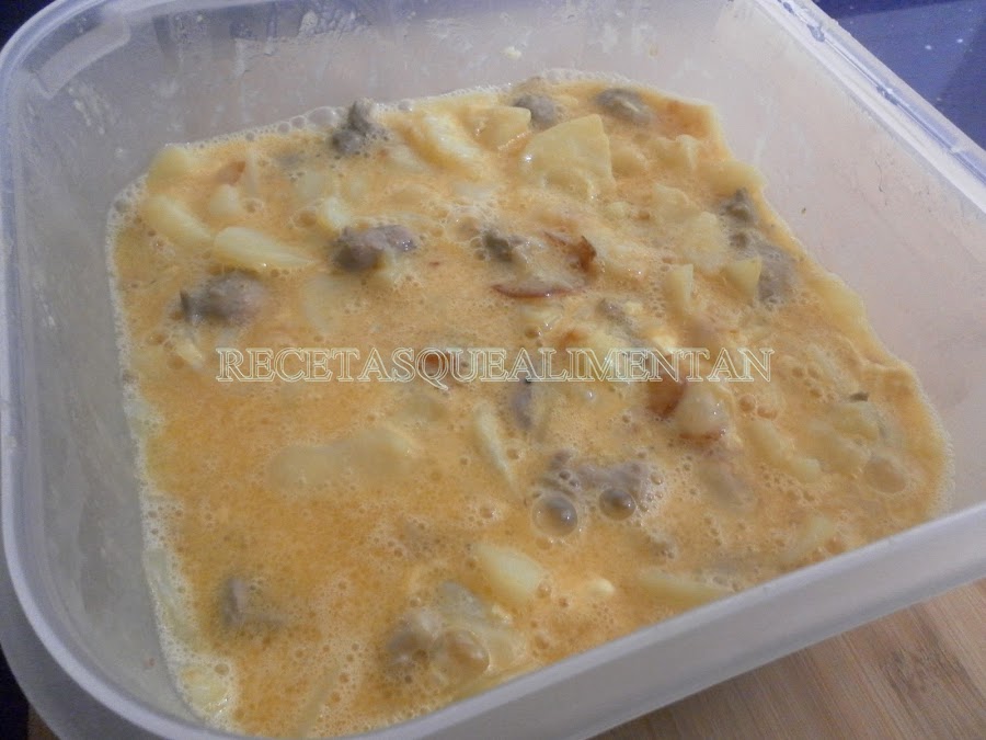 Escurrimos el aceite sobrante y colocamos las patatas en el bol con los huevos ya batidos. Incorporamos la carne de cerdo frita.
