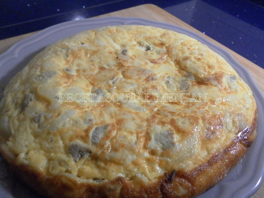 Volvemos a poner la sartén al fuego con una cucharada de aceite de oliva, cuando esté caliente vertemos el revuelto, dejamos a fuego lento hasta que vaya cuajando el huevo, damos la vuelta a la tortilla y ponemos nuevamente al fuego. Esperamos unos 5-8 minutos según nos guste más o menos hecha la Tortilla.