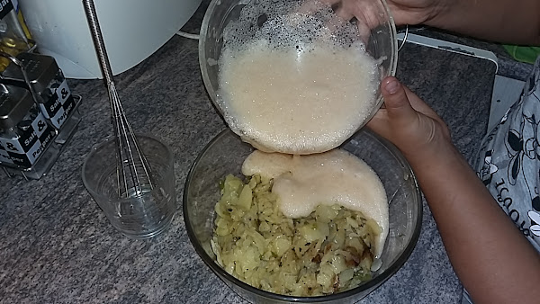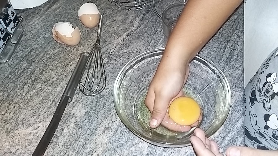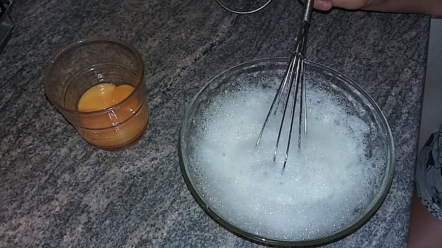 Separamos la yema de la clara.Batimos la clara hasta que saque espuma , echamos las yemas y las batimos con la clara añadiendo una cucharada de sal pequeña.