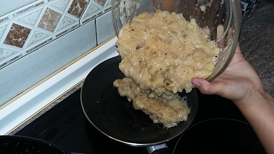 Dejamos reposar unos 5 minutos y luego cogemos una sartén echamos un chorríto de aceite y lo echamos en la sartén. Cuando veamos que la tortilla está hecha por un lado, le damos la vuelta con la ayuda de un plato grande para que se haga por el otro lado.