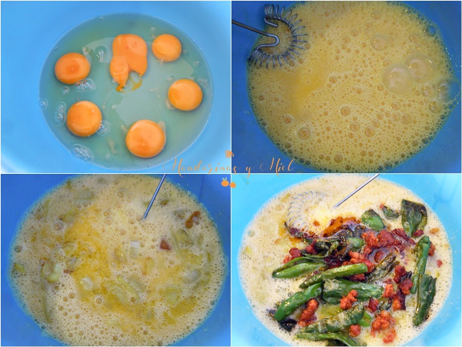 Bate los huevos en un plato hondo, y añade las patatas con cebolla y los pimientos con chorizo que tenías reservado. Mezcla bien.