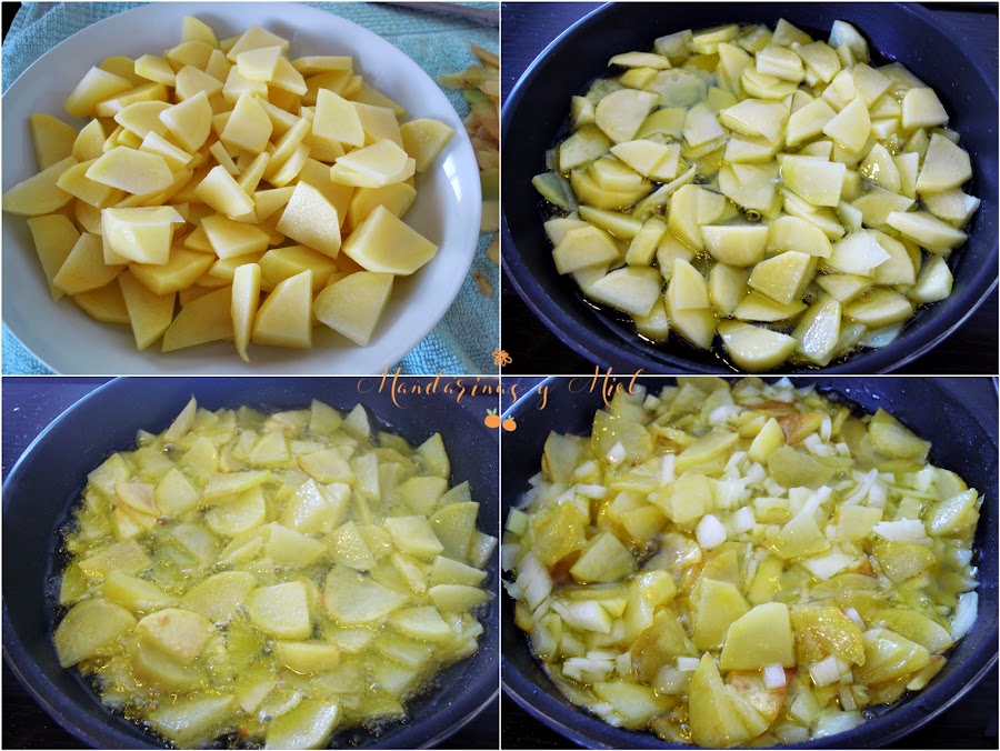 Pon una sartén con aceite al fuego y deja que se caliente bien, añade las patatas y fríelas a fuego lento, sazona al gusto.