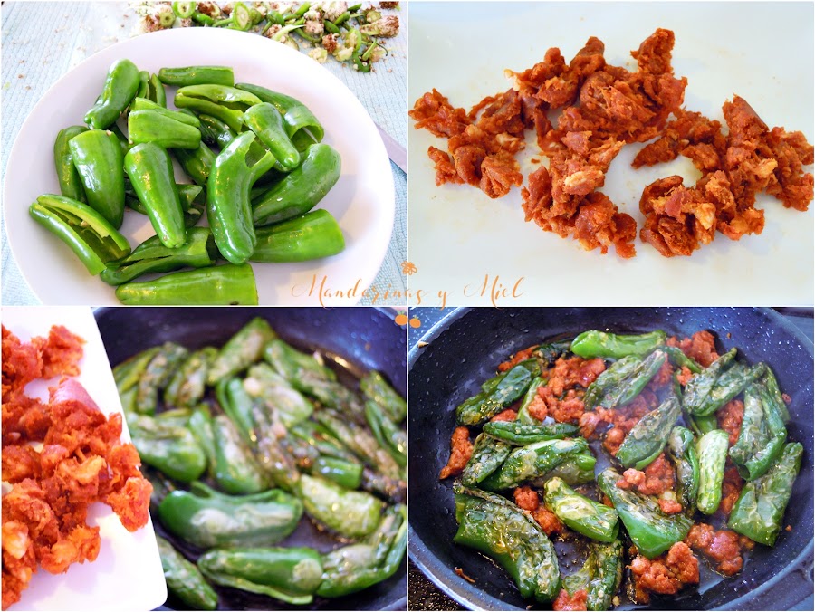 Añade al final el chorizo desmenuzado, rehoga todo junto, saca y escurre los pimientos con el chorizo también.