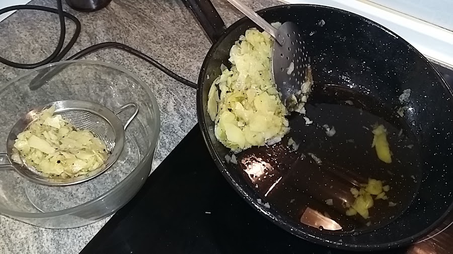 Ahora escurrimos la patata del aceite y la echamos con los huevos.