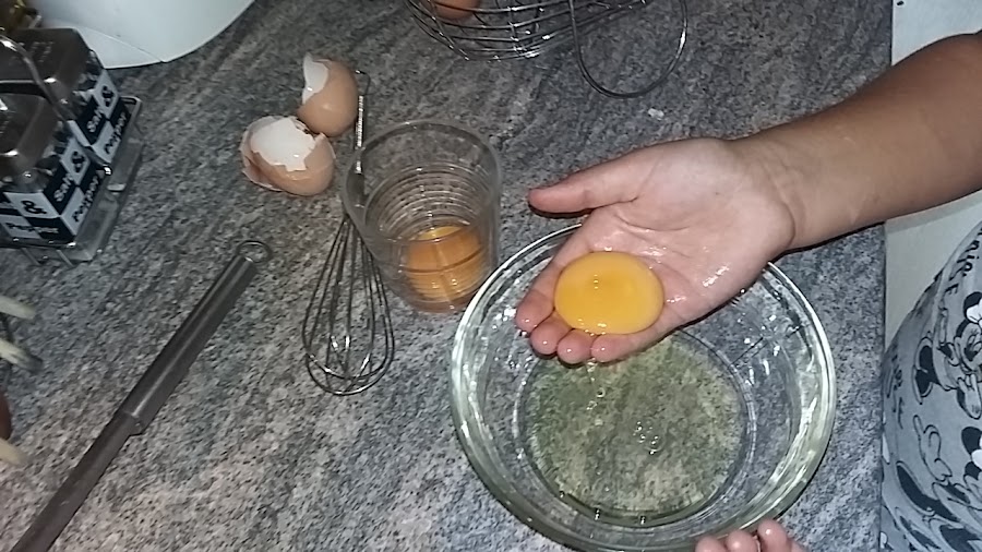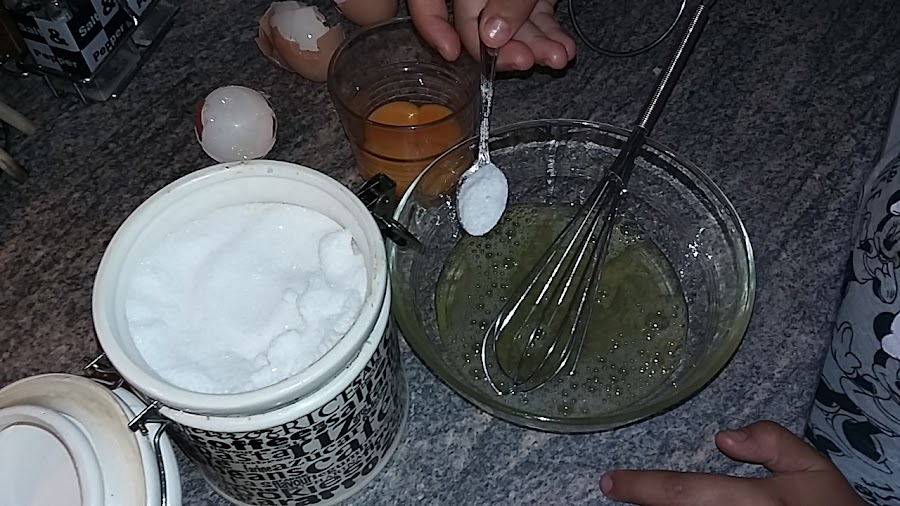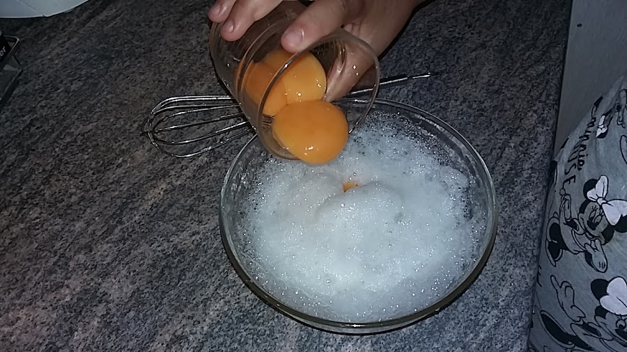 Separamos la yema de la clara.Batimos la clara hasta que saque espuma , echamos las yemas y las batimos con la clara añadiendo una cucharada de sal pequeña.