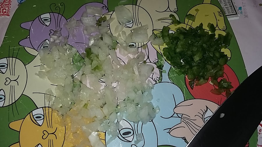 Pelar y picar las patatas , la cebolla y el pimiento. Lavar las patatas y escurrirlas. Echar en una sartén aceite y cuando esté caliente , echar las patatas , el pimiento y la cebolla.