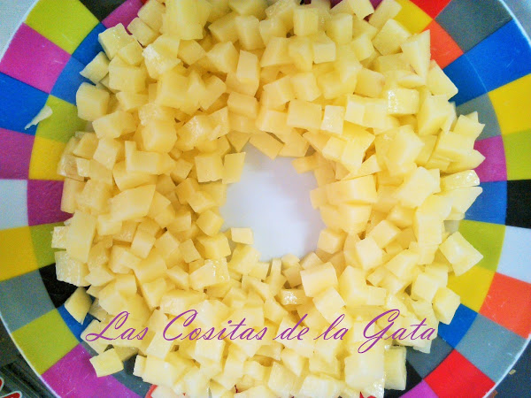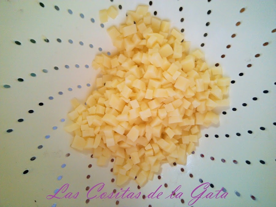 Se empieza pelando la patata y cortándola. Yo la corté en cuadrados pequeños, aprendí de mi suegra a hacer así la tortilla y me encanta. Después la lavé bien con agua fría para quitarle el almidón, y la sequé con papel de cocina. En un plato hondo se echa un poco de aceite, las patatas y poco más de aceite (a lo mejor dos cucharadas o tres en total, no hay que pasarse con el aceite tampoco. Remover las patatas, hacer un agujero en el centro, cubrir el plato con otro llano y meter al micro.
