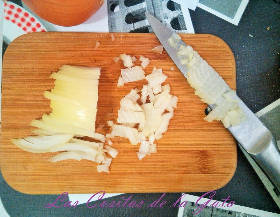Ahora toca la cebolla, si es que quieres la tortilla con cebolla. Pela y corta la cebolla en trozos pequeños, o como te guste. En una sartén echa una cucharada de aceite y pocha la cebolla al gusto. También se puede hacer al micro, igual que con la patata, pero a mí personalmente no me gusta la cebolla cocida.