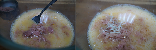Una vez hemos batido bien. Escurrimos el atún y lo añadimos a los huevos y un poco de queso rallado. Removemos y mezclamos bien.