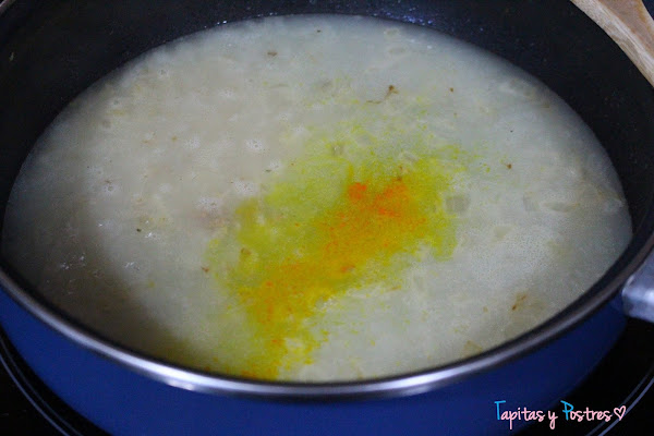 Incorporamos el caldo de pollo, el colorante, el concentrado y la hoja de laurel. Dejamos que hierva.
