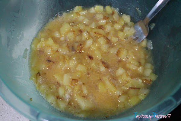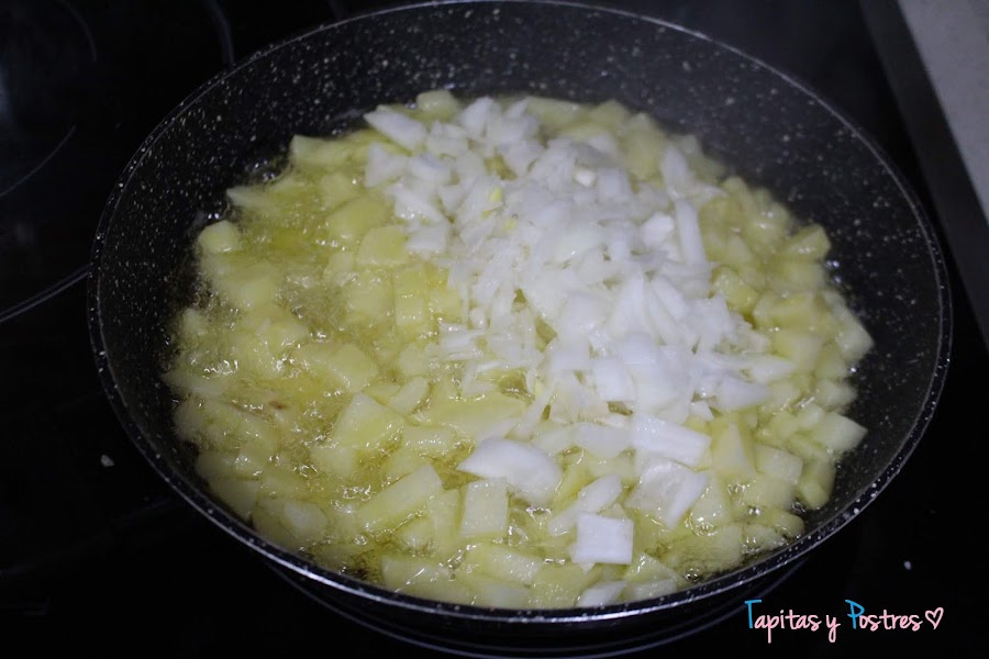 Comenzamos preparando la tortilla como tengamos por costumbre. Yo la hago así: pelamos y cortamos las patatas y la cebolla en cuadraditos. Las salamos y freímos en aceite caliente hasta que estén doradas. Sacamos de la sartén y escurrimos.