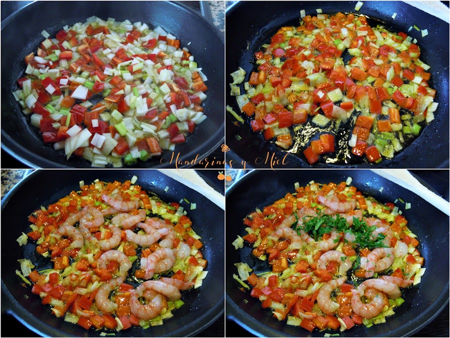 Cuando estén casi hechos, salpimenta y añade las gambitas peladas y el perejil picado, remueve con cuidado.