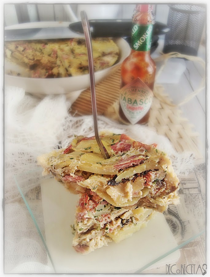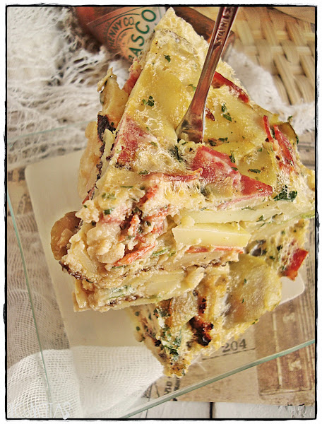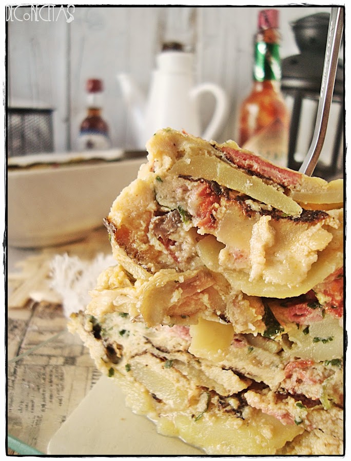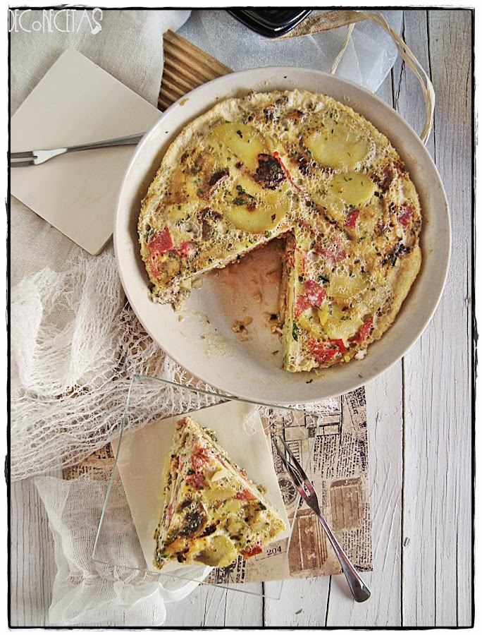 Queda muy bonita. La diferencia con una tortilla de patatas habitual es que además de no freír la patata como normalmente hacemos, la he cuajado en el horno, de ahí que se vean los ingredientes a plena vista