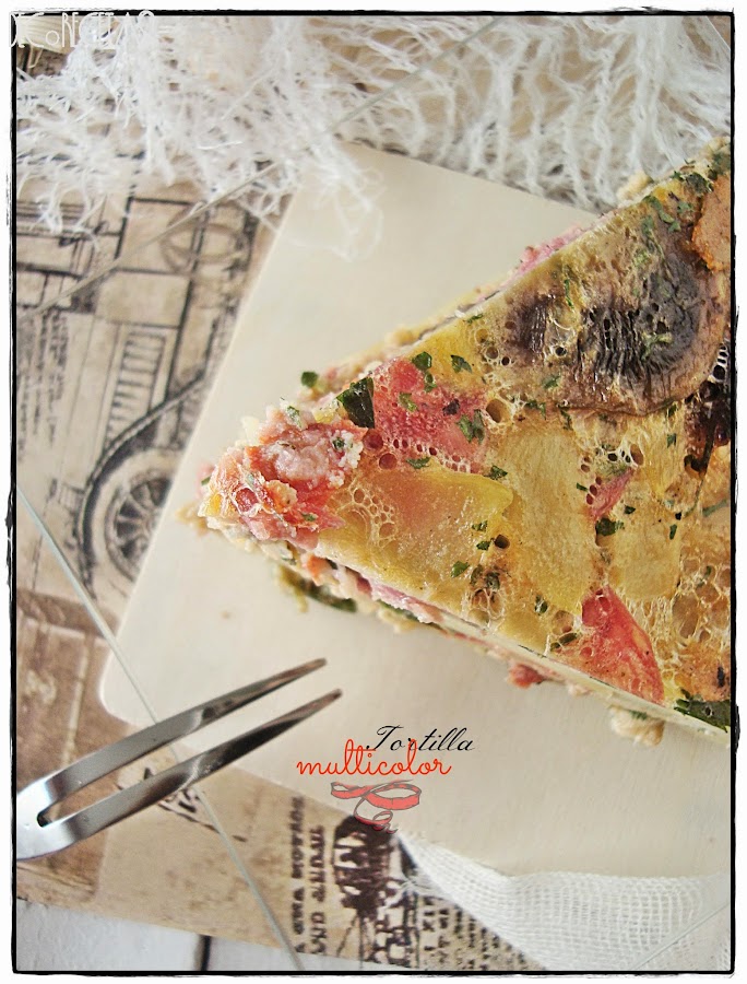 Se trata de una tortilla diferente con alimentos que tengamos por la nevera sin saber muy bien qué hacer con ellos. Lo suyo es juntarlos con la patata y el huevo de la típica tortilla y tendremos esta receta multicolor