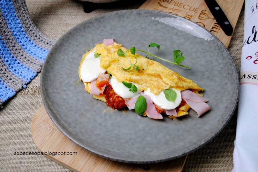 Deja que se cuaje a fuego medio bajo completamente y entonces echarle por encima salsa de tomate, la mitad del jamón y la mitad de la Mozzarella. Echar un poco de mejorana y pimienta. Doblar la tortilla y mantenerla en caliente mientras hacemos lo mismo con el resto de los ingredientes.