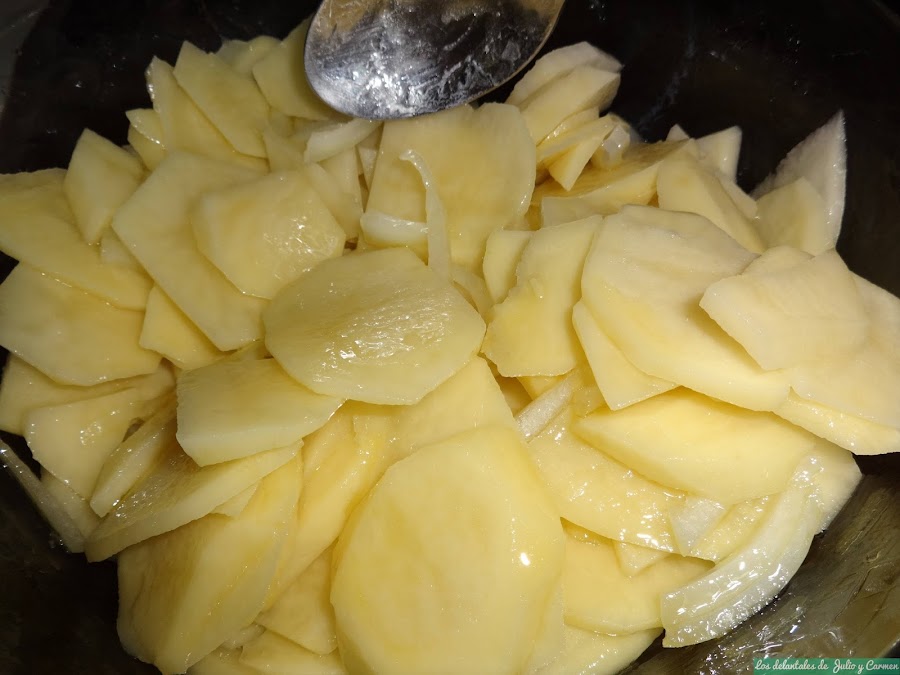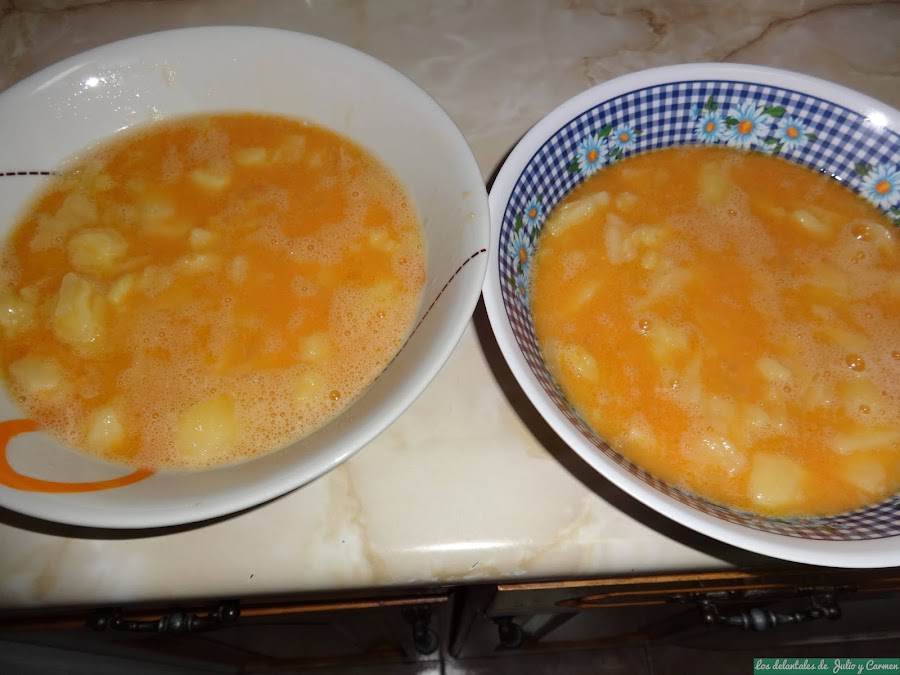 Batimos los huevos, salamos y echamos sobre ellos las patatas previamente escurridas del aceite sobrante. Podemos dividirlo en dos partes mas o menos iguales para después realizar el siguiente paso de manera mas fácil.
