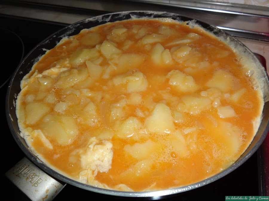 En una sartén con un poco de aceite, una vez caliente, vertemos la mitad de la mezcla de huevos y patata.