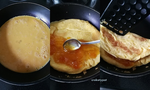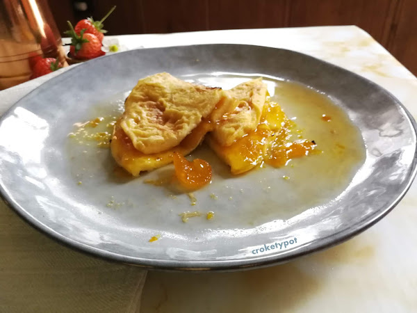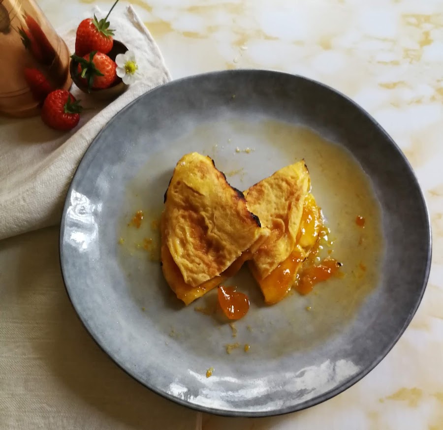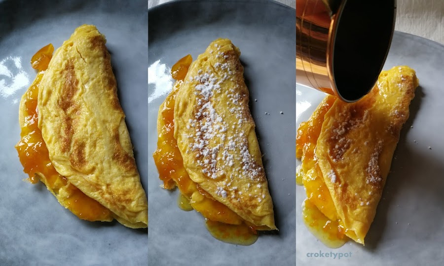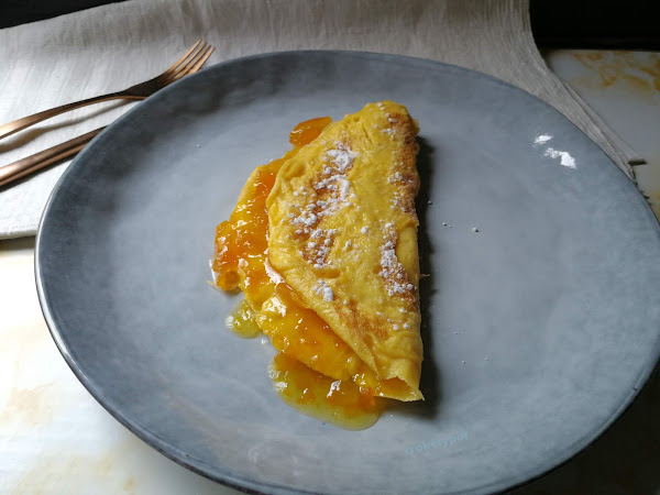 INGREDIENTES: 2 huevos, 1/2 cucharadita de azúcar, 1/2 cucharadita de esencia de vainilla, 2 cucharadas de mermelada de kumquat (podemos poner de albaricoque, cabello de ángel, ciruela, melocotón, naranja u otra fruta), mantequilla, azúcar glass, para flambear lo podemos hacer con coñac, ron u otro licor.