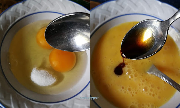 ELABORACIÓN: Batimos los huevos con la media cucharadita de azúcar, le añadimos la esencia de vainilla.