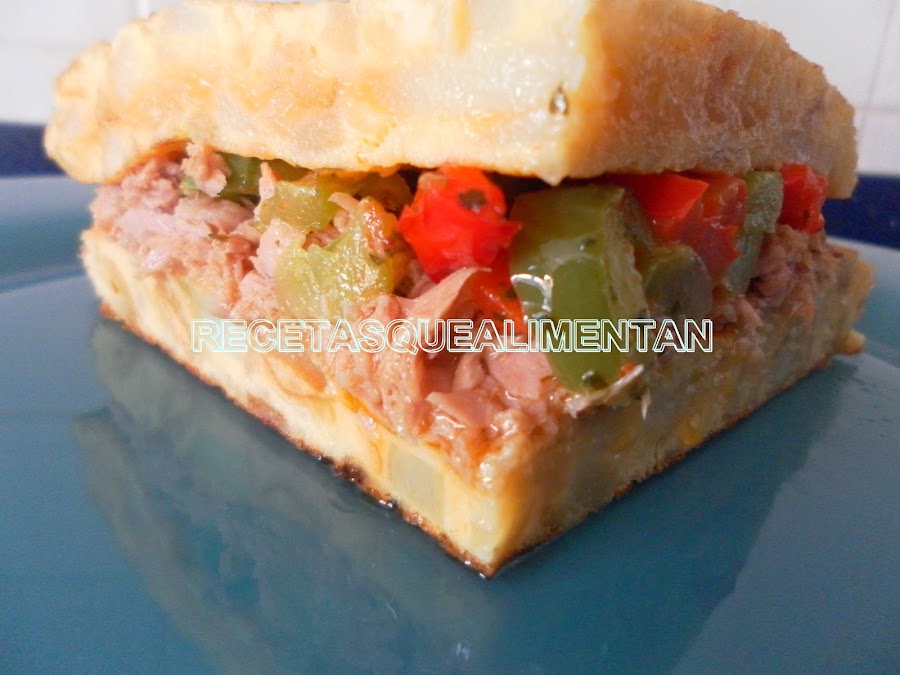 Cogemos una fuente y colocamos una de las tortillas, encima de esta disponemos el atún en conserva previamente escurrido y los pimientos fritos. Tapamos con la otra tortilla. Salud.