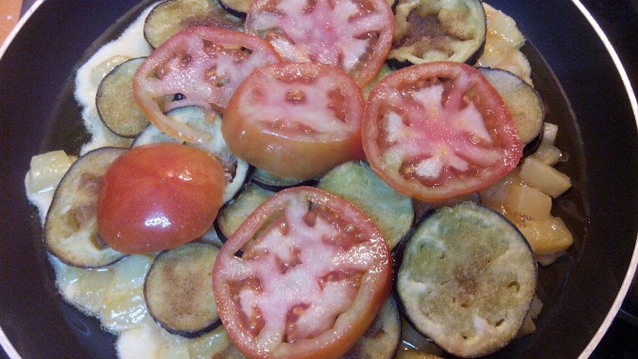 Ahora ponemos encima las rodajas de berenjena y tomate.