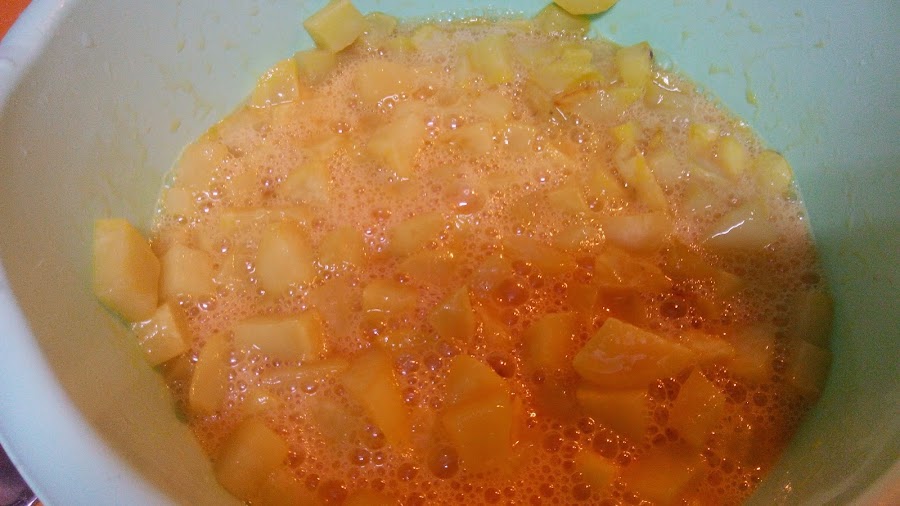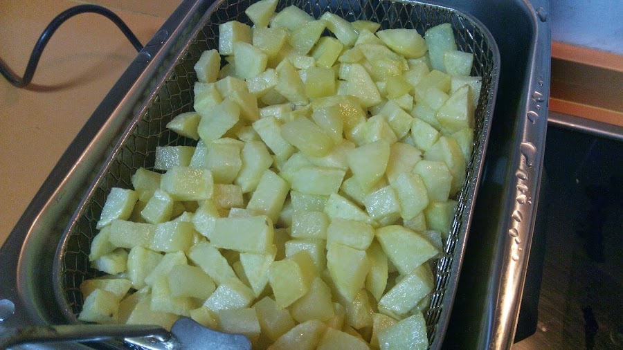 Mientras pelamos las patatas y las cortamos a dados. Las salamos y las freímos. Cuando estén listas, escurrimos y reservamos.