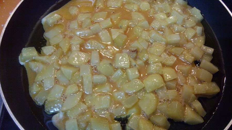 Y por último el resto de la mezcla de patatas y huevos. Y ahora sólo quedaría hacer la tortilla como cocinamos cualquier tortilla de patatas, teniendo cuidado a la hora de darle la vuelta para que no se os caiga parte del relleno.