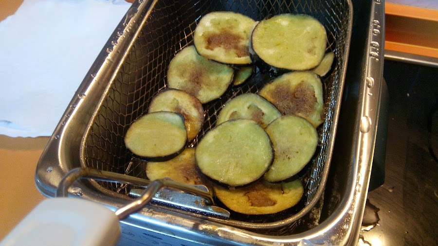 Ahora secamos las rodajas de berenjena y las pasamos por harina. Las freímos también. Una vez listas escurrimos y reservamos.