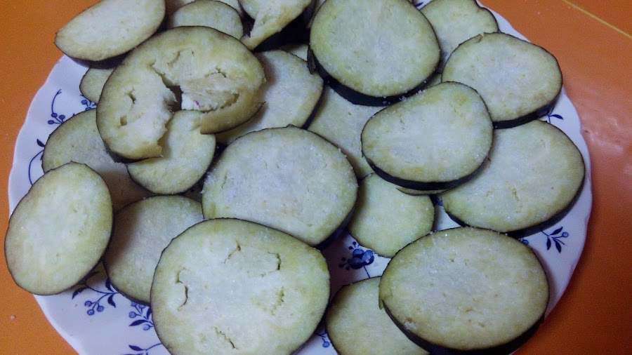 Lavamos la berenjena y la cortamos a rodajas. Las salamos y las dejamos en reposo un rato, 20 o 30 minutos.