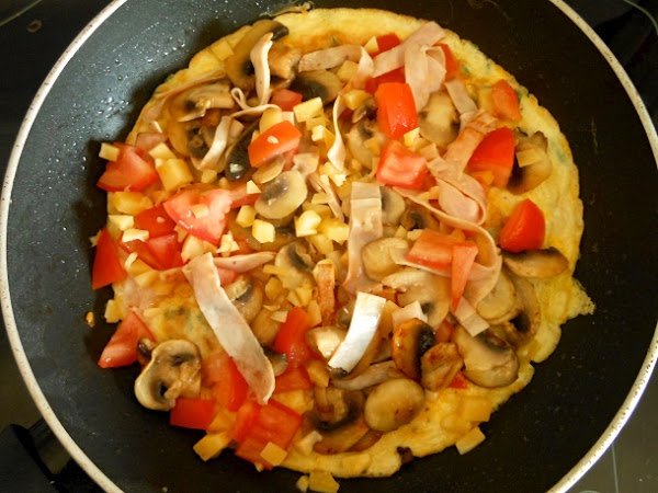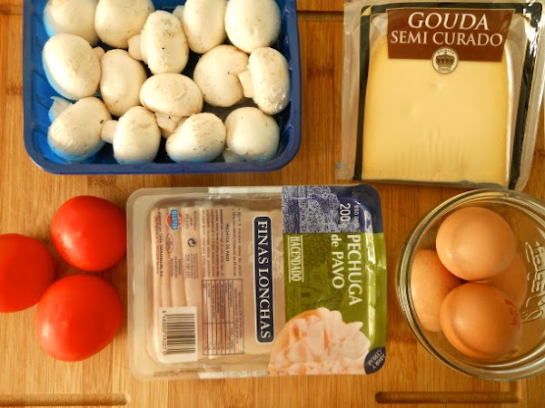 A continuación dispón la mezcla de champiñones y pechuga de pavo encima de la tortilla. Agrega también el tomate picado y los dados de queso.