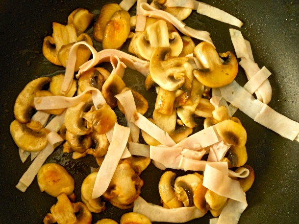 Tras esto retira los champiñones y las lonchas de pechuga de pavo de la sartén y resérvalo en un plato llano.
