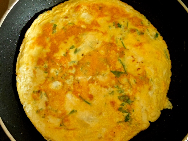 Cuando el aceite esté caliente vierte la mezcla de huevos batidos y cuaja una tortilla. Cuando esté hecha por el lado que está en contacto con la base de la sartén, dale la vuelta con la ayuda de un plato llano y cuájala por el otro lado.