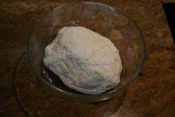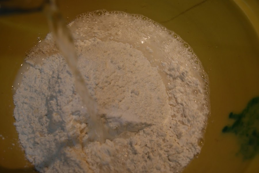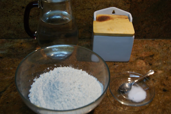 En un cuenco echamos la harina, el bicarbonato y la sal y vamos agregando agua y removiendo hasta formar una bola de masa.
