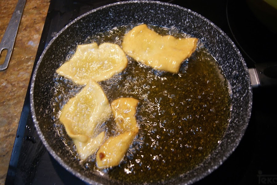 Ponemos aceite abundante en una sartén y las vamos friendo hasta que cojan un tono dorado.