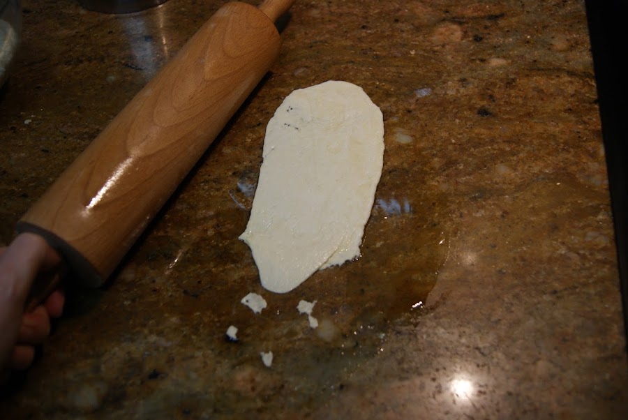 Echamos un poquito de aceite al mármol, cortamos porciones de masa y la estiramos con el rodillo bien fina.