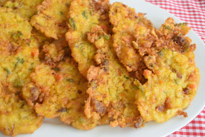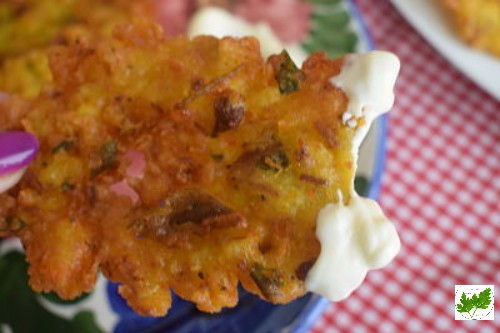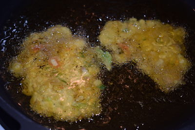 Calienta abundante aceite en una sartén. Echa una cucharada grande de esta masa en el aceite caliente, esparciéndola un poco con la cuchara para que quede una tortilla fina y crujiente al freírla.