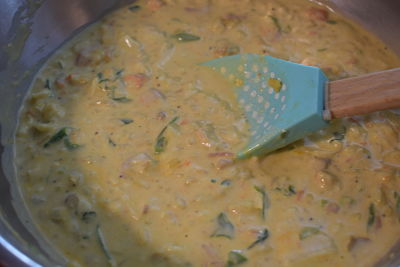 Pica muy menudita la cebolla y el perejil fresco. En un bol pon la harina y ve añadiendo poco a poco el agua removiendo con unas varilas. Añade la cebolla y perejil picados, el resto de arroz y la cúrcuma. Remueve para que quede todo bien integrado. No debe quedar una masa espesa pero tampoco demasiado líquida.