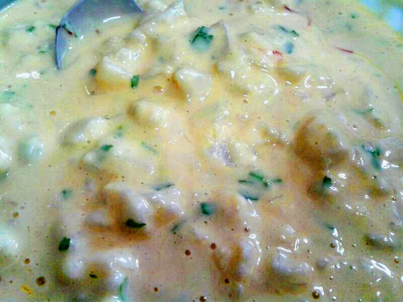 Una vez desalado, picamos los dientes de ajo junto con el perejil. Le añadimos el azafrán y los huevos. Batimos bien todo el conjunto y le agregamos el bicarbonato y la harina.