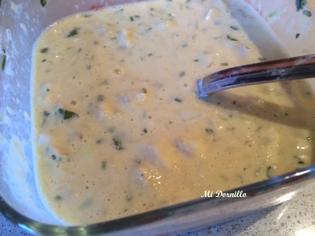 Batir los huevos bien y añadirle un chorrito de leche (Opcional), añadimos el bacalao y las cebolletas,ajos,perejil y hierbabuena picadito. Mover bien todo.