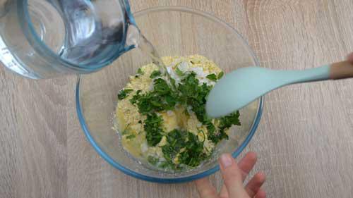 Incorporamos la cebolleta cortada, el perejil picado y agregamos agua bien fría poco a poco a medida que mezclamos estos ingredientes.