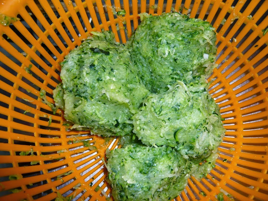 Rallamos el calabacín y lo ponemos a escurrir para que suelte el agua. De vez en cuando lo estrujamos para que la suelte antes.