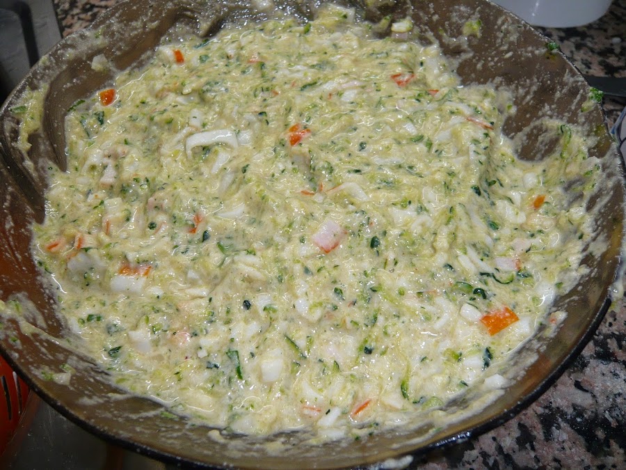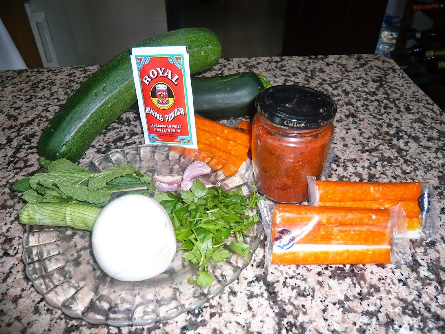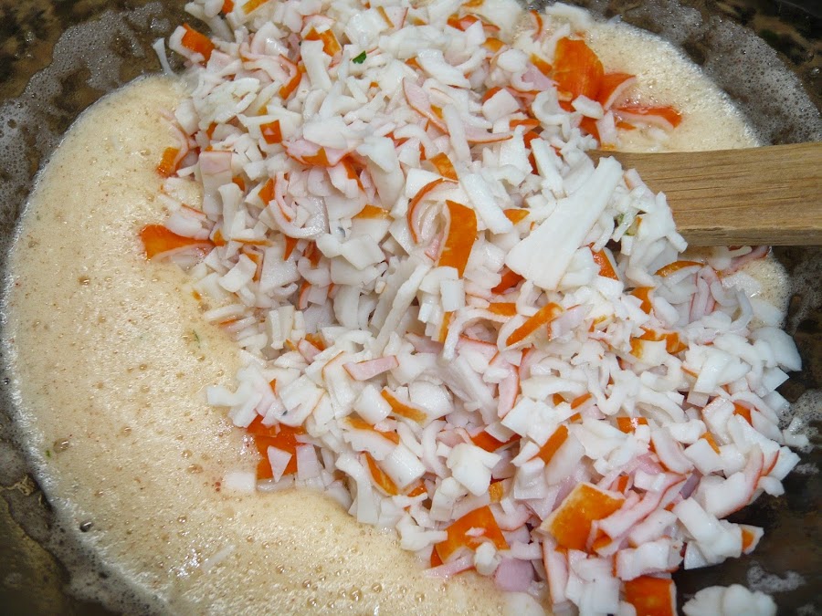 Picamos los palitos de cangrejo, la cebolla, los ajos, el perejil y la hierbabuena. En un bol, batimos los huevos con la levadura incorporamos el pimiento molido.
